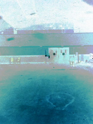 A large number of photos were taken in the main hall. Out of this series of photos two stood out as strange. On the first two photos below, a large blue anomaly is present in the air, it also appears to be in the centre of a tube running from the ceiling to the floor the next two photos taken show this anomaly on the ground. The photos before and after these shots show nothing. The two photos to the right of each one is when colour contrasting is added. Blue is spiritually associated with psychic energy and truth. It is a very calming color, and many people associate it with spiritual guidance.