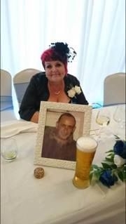 (Photo Left) The brides father's picture at the wedding reception. The small box in front of the picture are part of his ashes.