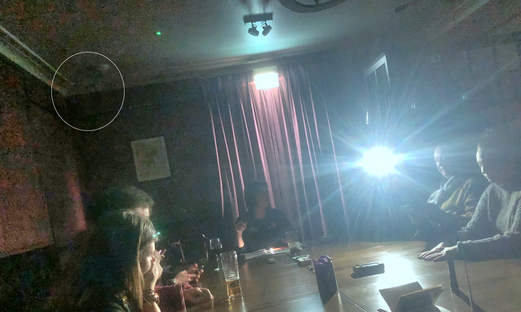 The first capture for this update page was taken by Paige Hughes. This photo taken in The Billiard Room together with a few more images and taken at 01.52 during a seance. On reviewing Paige spotted what appears to be a face of a guy wearing a hat; to the top left of the photo (circled) and appears to be looking directly down towards the Medium.